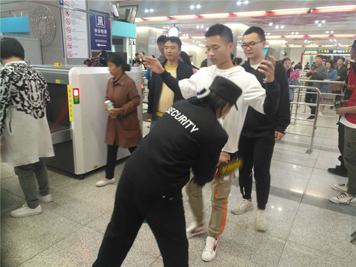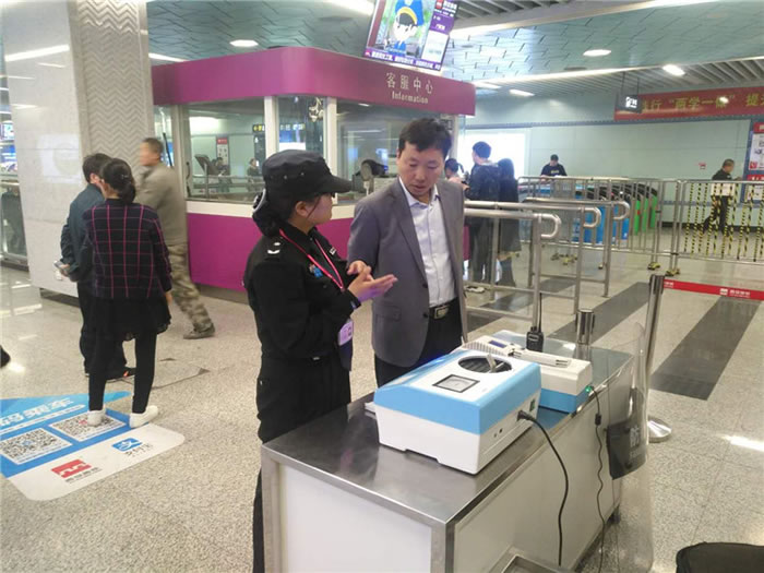 安檢員按工作流程對進(jìn)站乘客進(jìn)行人身檢查